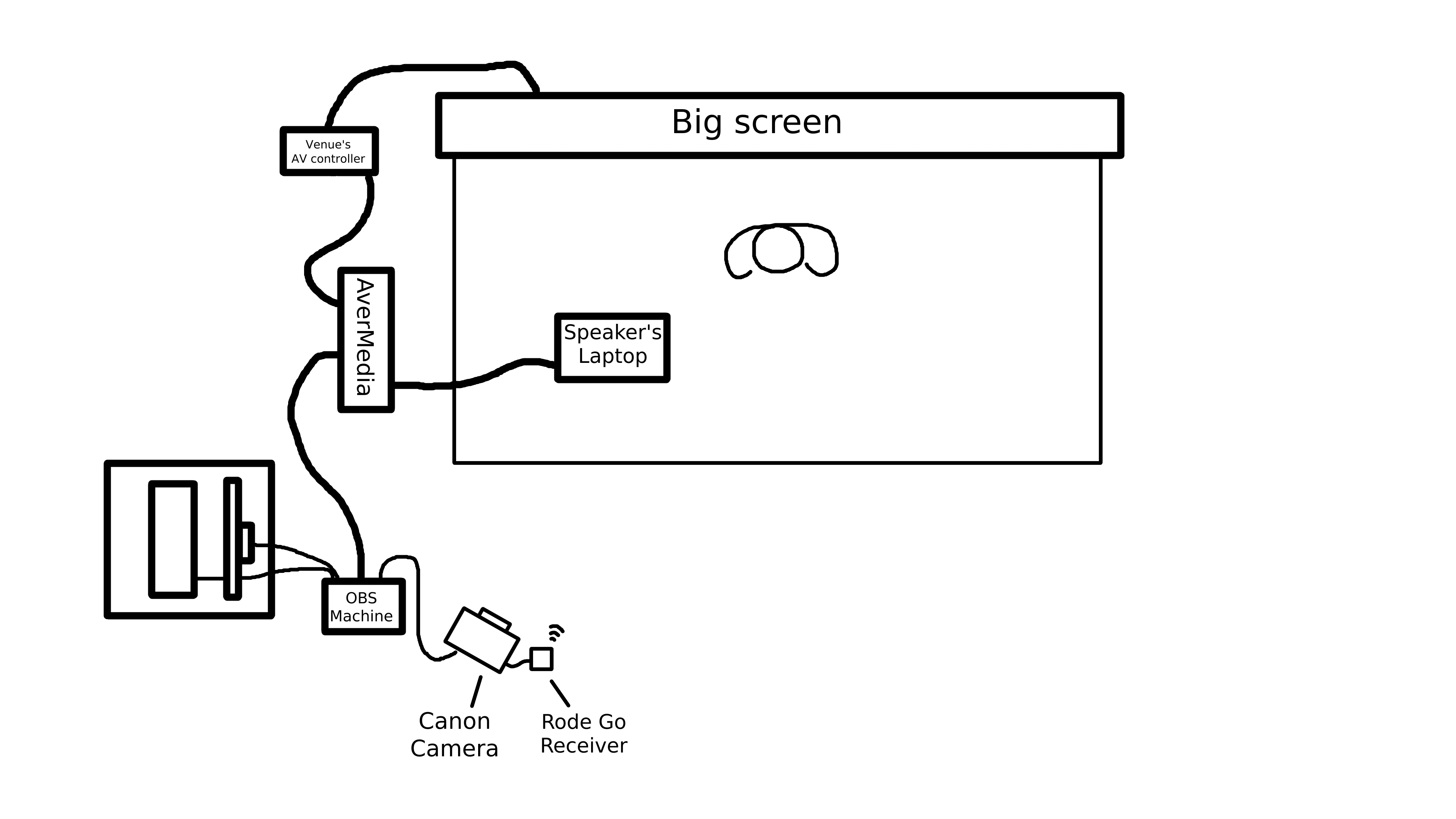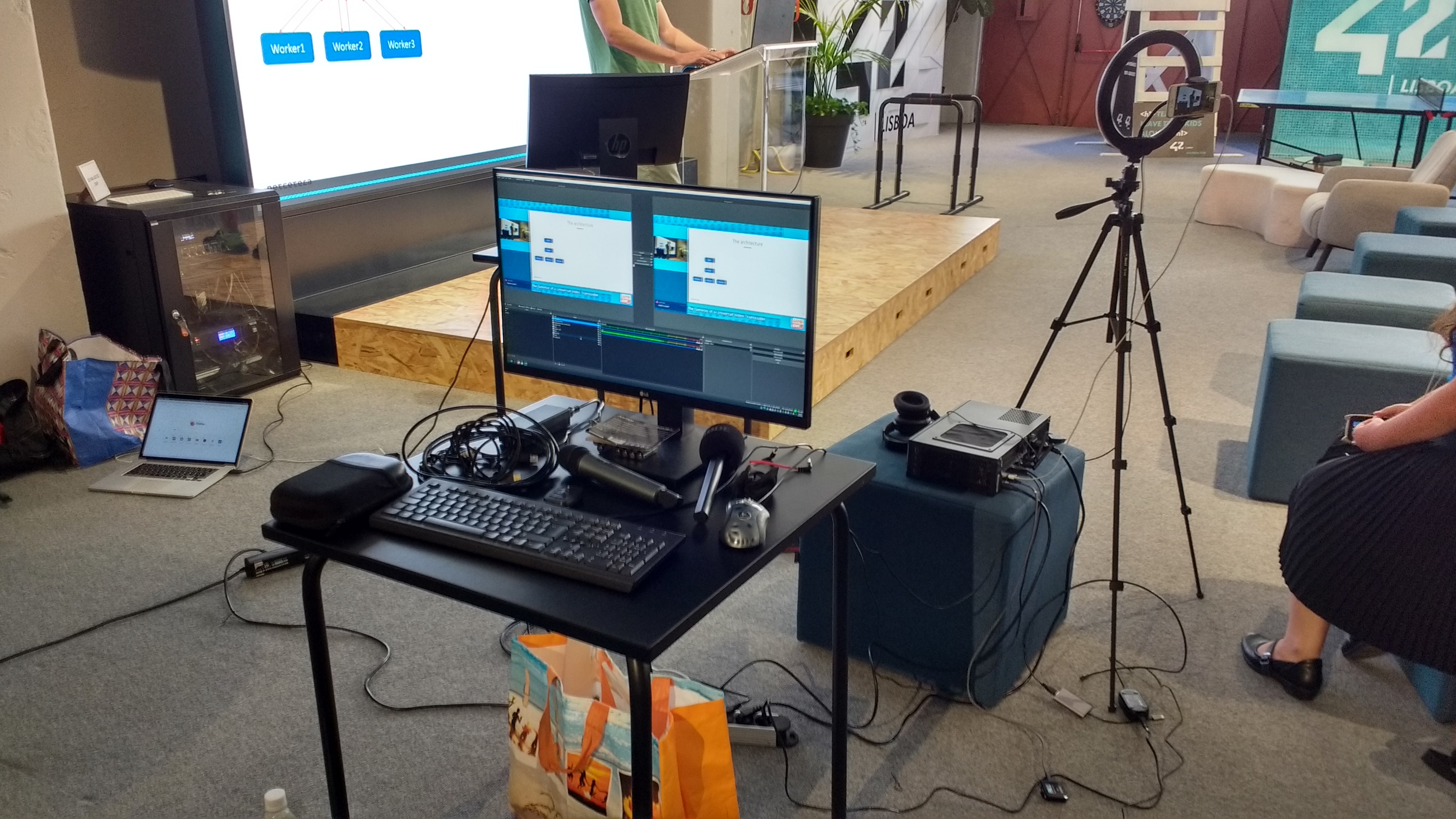 We wanted to capture the speaker’s voice, computer screen, and have a camera pointed at the stage. We also wanted to livestream the whole thing. The organizers told me the venue had a large screen, so no need to bring an image projector.